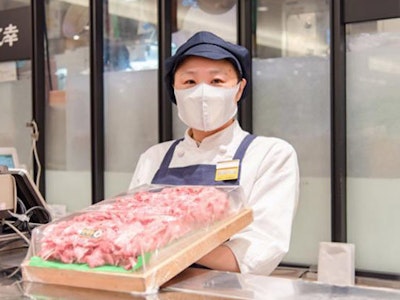三越・伊勢丹内の食品フロアにある二幸ミートで接客販売を行い