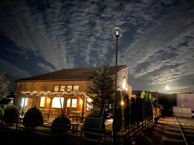 あづみ野店は、雄大な北アルプスの麓、テラス席とイートインスペースを備えた大きなログハウス風の建物。
