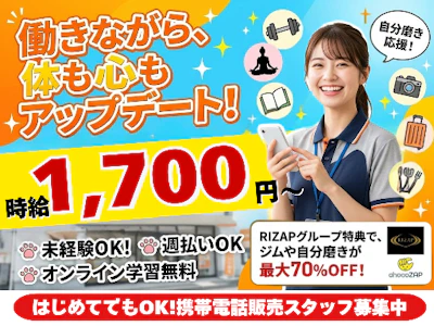 〈☆時給1,700円~☆〉の高待遇/未経験歓迎の携帯販売スタッフ/研修充実で安心/ノルマなし/ライザップグループ社割あり/オープニング募集/携帯販売48